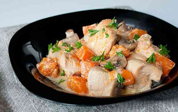 Куриную грудку, тыкву порежьте кусками. Лук нарежьте тонкими полукольцами, грибы, если крупные покрошите помельче. Все положите в кастрюлю или чашу мультиварки. Налейте воды, сок лимона, соус. Тушите примерно 30 минут на тихом огне под крышкой. Влейте сливки, перемешайте и подержите на огне, помешивая, еще 7-8 минут.