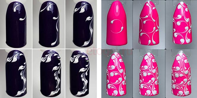 Рисовать на ногтях иголкой не так уж и сложно. Ниже мы привели несколько подробных схем, которые подскажут, как нарисовать узоры, как самые легкие, так и более сложные.
