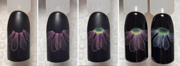 В углу ногтевой пластины кисточкой ставится точка, далее она окружается еще пятью точками по кругу. Для завершения рисунка иглой/булавкой сердцевина цветочка соединяется с лепестками тонкой линией, пока лак еще мокрый.