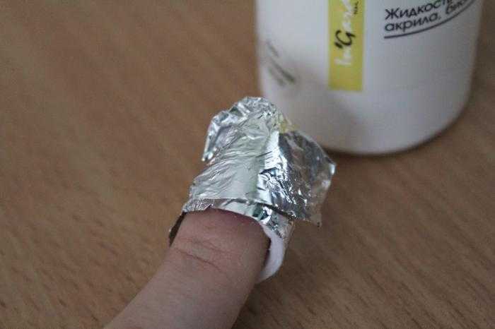 Далее берем ватные диски, смачиваем их в средстве для снятия гель-лака, кладем каждый диск на ноготь и плотно оборачиваем каждый палец фольгой.