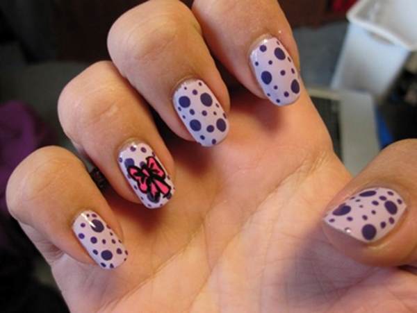 Понадобится розовый и фиолетовый лаки; дотс; наклейка бантик.