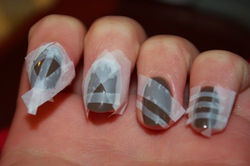 Начиная делать маникюр при помощи скотча, подготовьте лаки двух различных оттенков и прозрачное покрытие. Рисунки на ногтях для начинающих пошагово выполняются по такой технологии:
