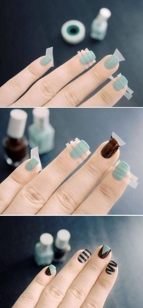 Геометрический узор на ногтях можно легко сделать, используя клеющиеся ленты. Их легко заменить обычным канцелярским скотчем. Самый легкий маникюр, сделанный таким методом – всевозможные полоски и блоки на ногтях. Для начала ногтевая пластина покрывается базовым лаком. После его высыхания, сверху наклеиваются кусочки скотча, а не заклеенная часть выкрашивается другим лаком. Так можно сделать двухцветный маникюр.