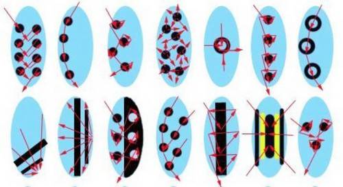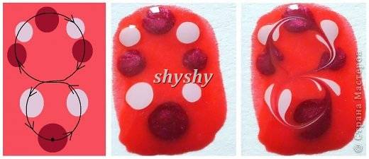 Теперь, будьте быстрой, прежде чем верхний слой высохнет. Сделайте несколько капель на ноготь лаком нужных цветов, и перемещайте иглу на поверхности в форме «8», в виде горизонтальных или вертикальных линий. Схемы рисунков по созданию рисунков с помощью иголки на ногтях приложены к уроку.