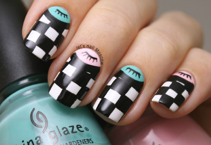 Аналогично на ногтях рисуются полосы и другие геометрические фигуры. Один из самых популярных сегодня маникюров – шахматный, тоже можно сделать, используя скотч, который нарезается небольшими полосками в виде трафарета.