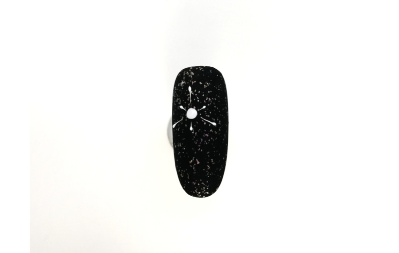6. Дорисуем снежинку-компаньона и поставим дотсом несколько белых точек на фоне. Полимеризуем рисунок в лампе 60 секунд. Или можно посыпать снежинки акриловой пудрой и полимеризовать 120 секунд.