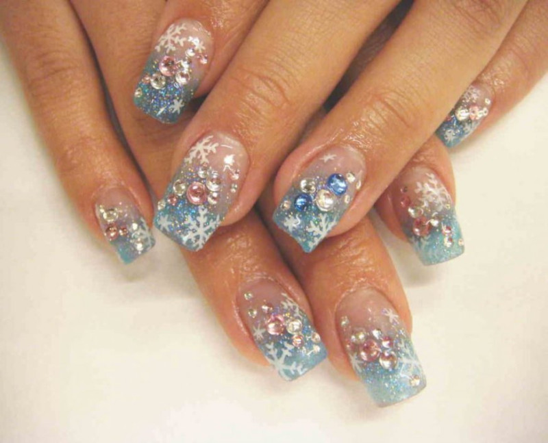 Хорошо будет смотреться на ледяном омбре множество снежинок, выполненных более контрастным цветом нежели фон.