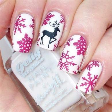 Мы привыкли рисовать сложные снежинки, которые не похожи друг на друга. Но почему бы не сделать интересный дизайн в скандинавском стиле. Что это такое? Это узор, который мастерицы использует при вязании свитеров и других аксессуаров. Маникюр получится довольно однотипным, сделать его можно с помощью наклеек или стемпинга. Вы можете немного разнообразить его, покрыв отдельные рисунки блестками или прорисовав контур другим цветом.