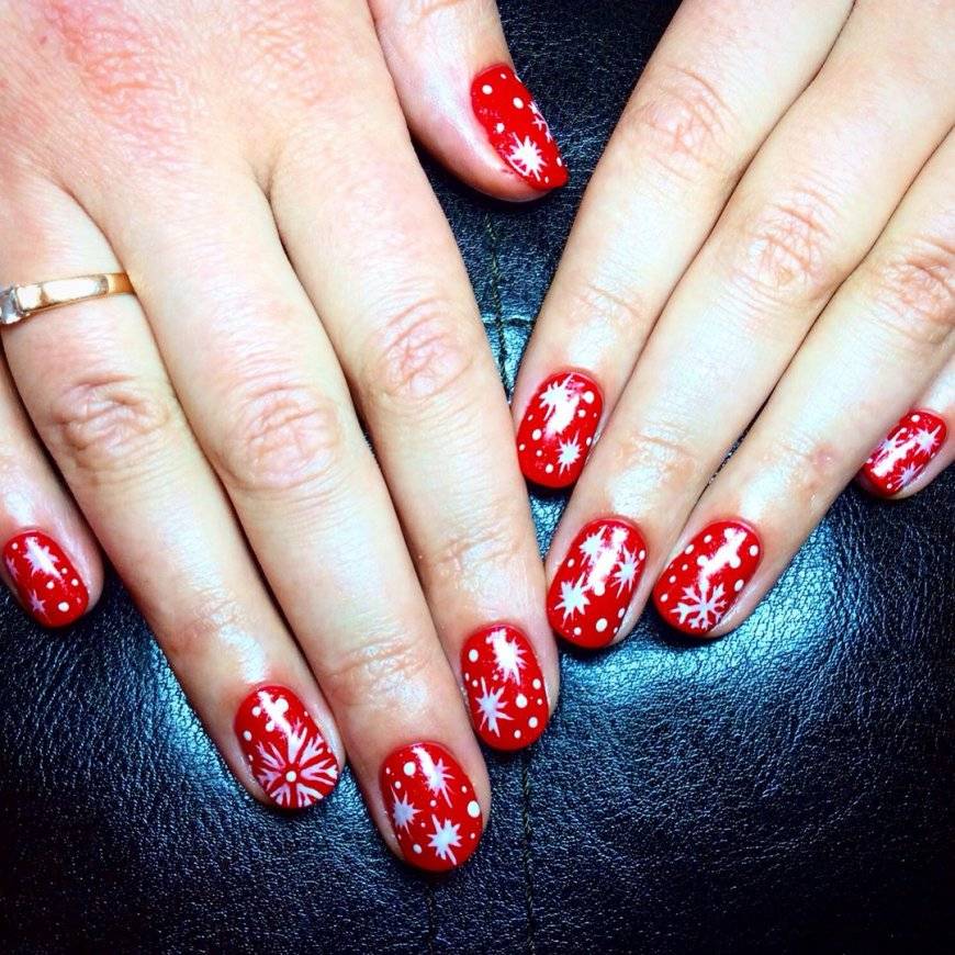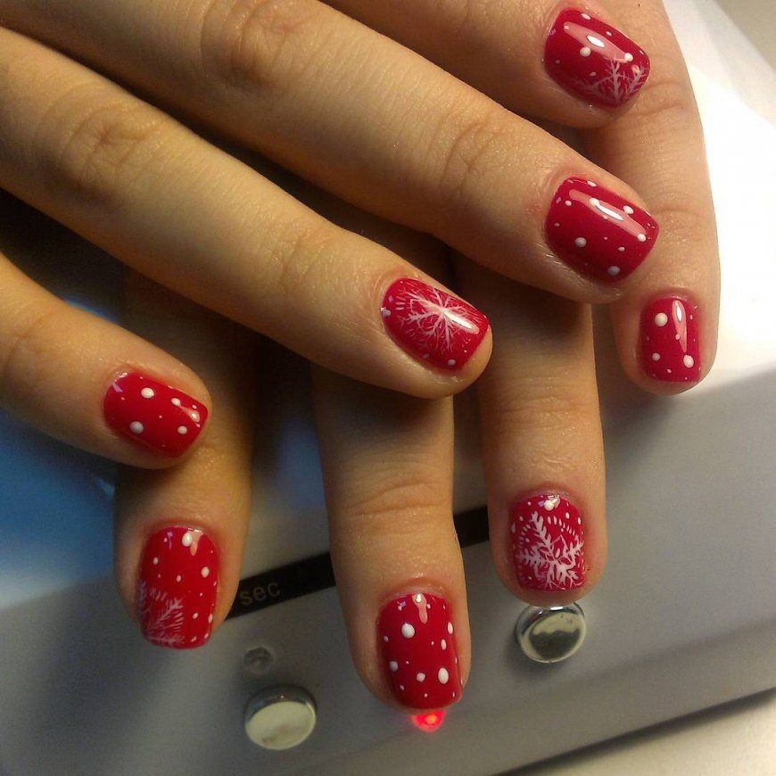 На короткие ногти хорошо «ляжет» маникюр в скандинавском стиле. Здесь на красный фон наносится декор в виде белых незамысловатых снежинок разного размера.