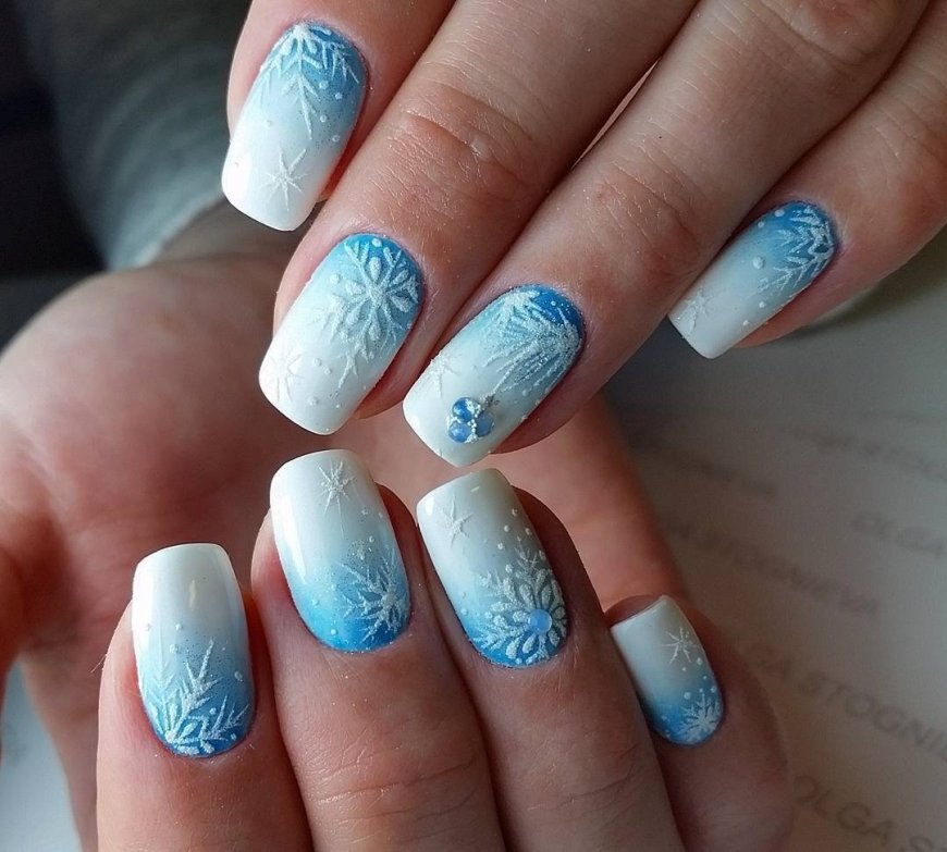 Хорошо будет смотреться на ледяном омбре множество снежинок, выполненных более контрастным цветом нежели фон.
