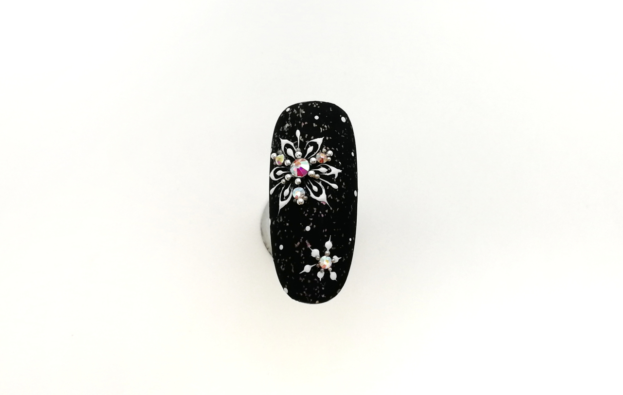 Середину снежинок украсьте при помощи небольшой стразы из горного хрусталя. Теперь закрепите изображение базовым покрытием.