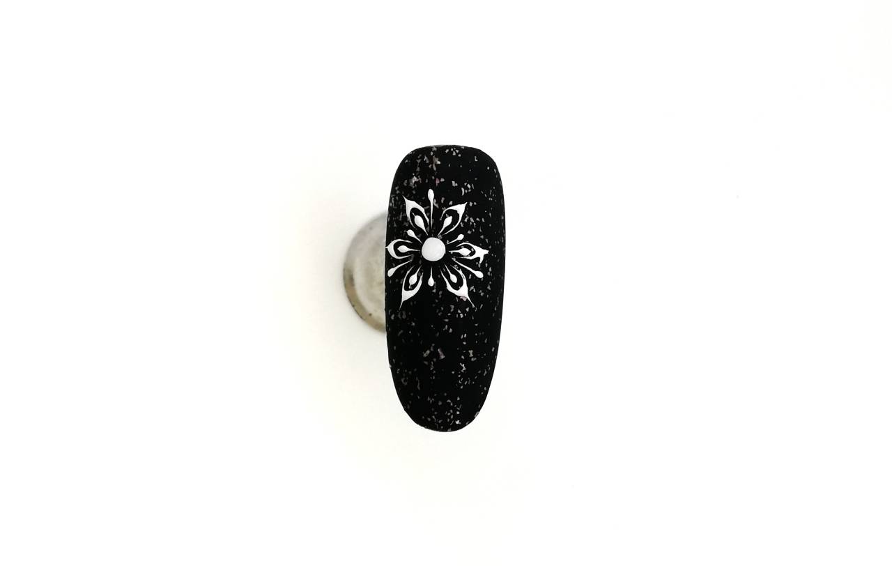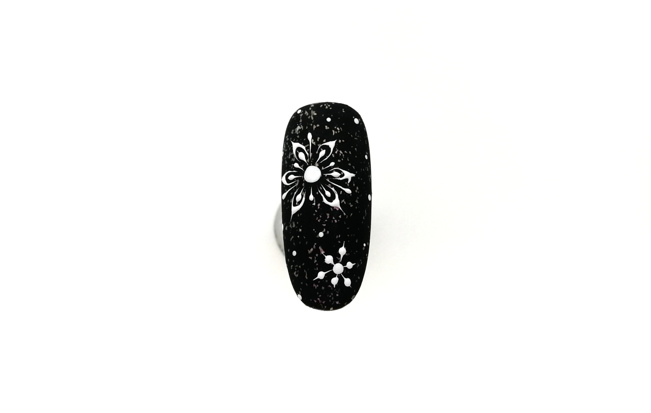 6. Дорисуем снежинку-компаньона и поставим дотсом несколько белых точек на фоне. Полимеризуем рисунок в лампе 60 секунд. Или можно посыпать снежинки акриловой пудрой и полимеризовать 120 секунд.