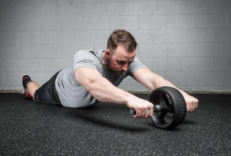 Держась выпрямленными руками на ручки ролика, упереться им с пол и расположить его строго под плечами. Медленно начать откатывать колесо вперед на расстояние вытянутых рук, так же медленно вернуться в исходное положение. Этот самый простой вариант, но довольно эффективный для проработки пресса. Для работы над косыми мышцами пресса выполняется похожее упражнение, но ролик откатывается не вперед, а немного в сторону от корпуса тела.