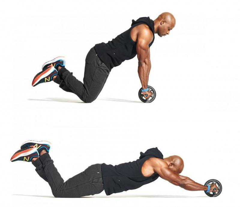 - Поднимитесь на колени и колесо для пресса поставьте перед собой. Обопритесь на него руками и плавно двигайтесь вперед, а после этого в исходное положение.