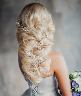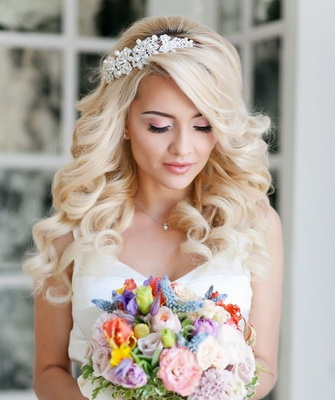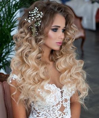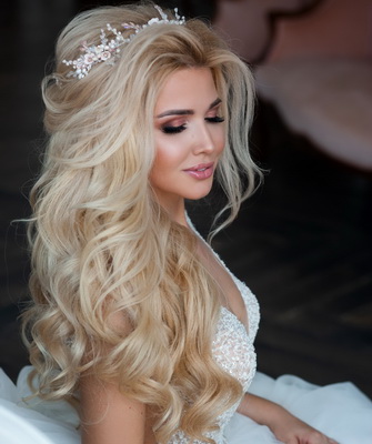 База любой (будь-то свадебной или вечерней) прически – локоны и стандартная укладка. Тут уже можно проявить свою фантазию, посмотрев на фото известных людей с распущенными уложенными волосами. Если даже не очень много времени — можно самой создать творение на голове, дополнив укладку акцентов в виде украшения, заколки с камнями, короной, цветочками из органзы либо натуральные. Шпильками или невидимками сможете зафиксировать под ухом большой цветок и бросить пряди распущенными. Обычно и нестандартно смотрится венок из цветов на распущенные завитки.