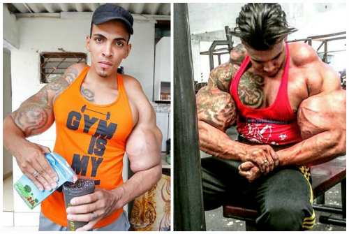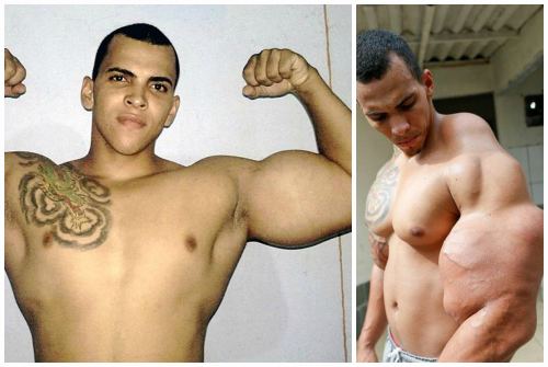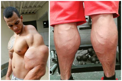 Все беды бразильского фрика случились из-за его пристрастия к синтолу. Покатые плечи никак не гармонируют с каменными бицепсами 65-сантиметрового объема. Результат не нравился «бодибилдеру», но он не остановился, а стал еще упорнее колоть не только руки, но и плечевой пояс, и даже икры на ногах.