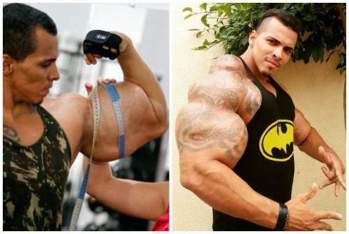 - Аплиндо Де Суоза, бразильский спортсмен, переплюнувший по размеру мышц всех своих соперников. Объем его мускулов составляет 73 сантиметра. Но бодибилдер выглядит при этом скорее ужасающе, чем впечатляюще. Аплиндо утверждает, что никаких отрицательных моментов, за исключением головокружения, он не испытывает. Но специалисты считают, что всему свое время.