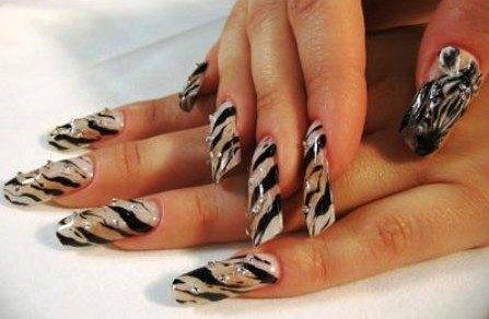Нанести рисунки для ногтей, имитируя при этом расцветку шкуры зебры или леопарда, не составит особого труда, а выглядят такие узоры очень впечатляюще.