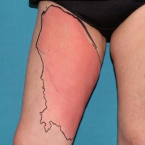 При эритематозной форме рожистого воспаления на отечной коже появляется красное пятно. Постепенно пятно становится все ярче и ярче и словно языки пламени быстро распространяется на здоровые ткани. Наиболее ярко-красный окрас наблюдается по периферии пораженного участка. Пятно четко отграничено от здоровой, непораженной ткани. Края пятна неровные, напоминают языки пламени или же географическую карту.