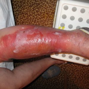 Рис. 10. При эритематозно-буллезной форме рожистого воспаления на месте спавшихся пузырьков образуются корки бурого или черного цвета.