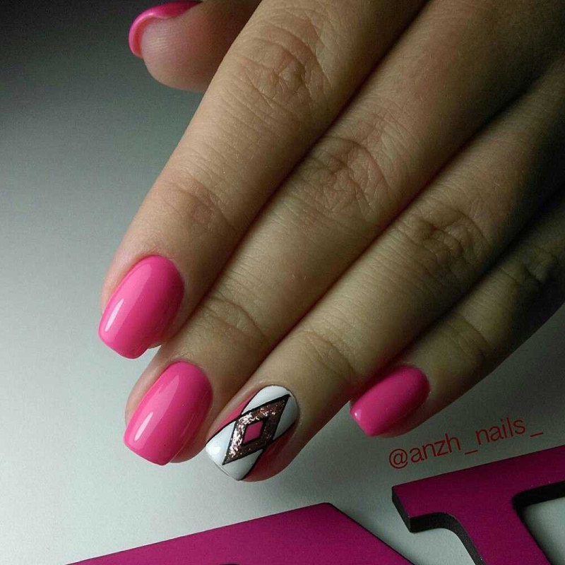 Ярко розовый маникюр отлично будут смотреться в сочетании с белыми полосками, геометрическими фигурами или маленькими точками. Также их можно отделать блестками, фольгой или камнями, сделать концы ноготков разноцветными.