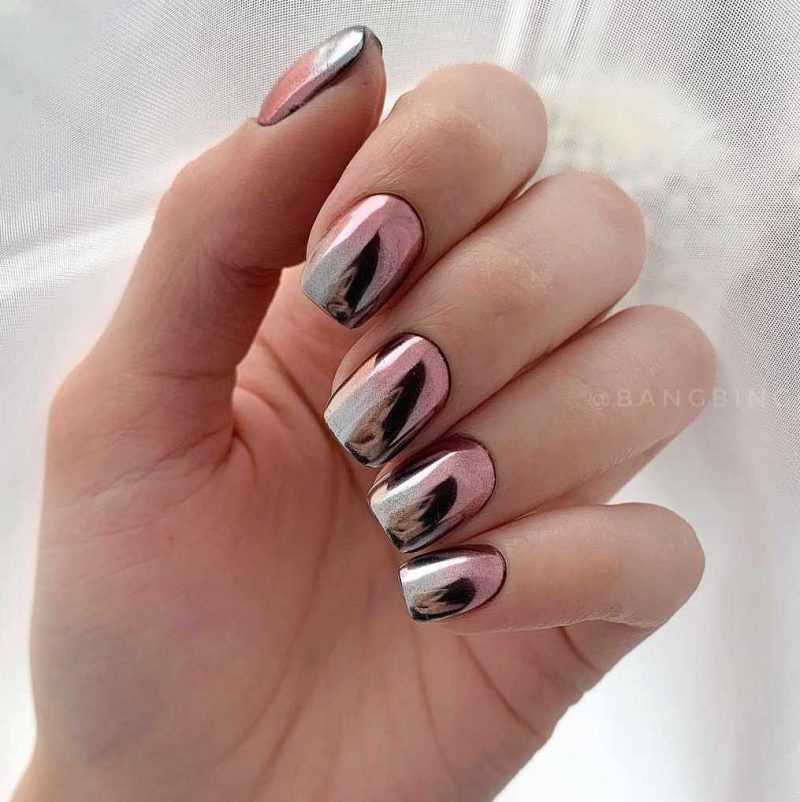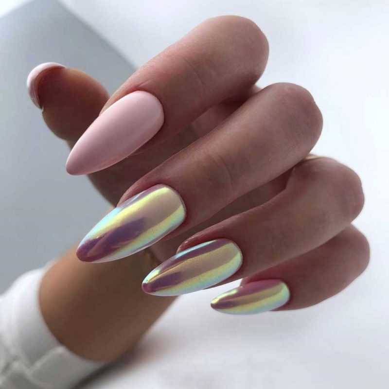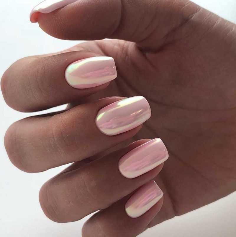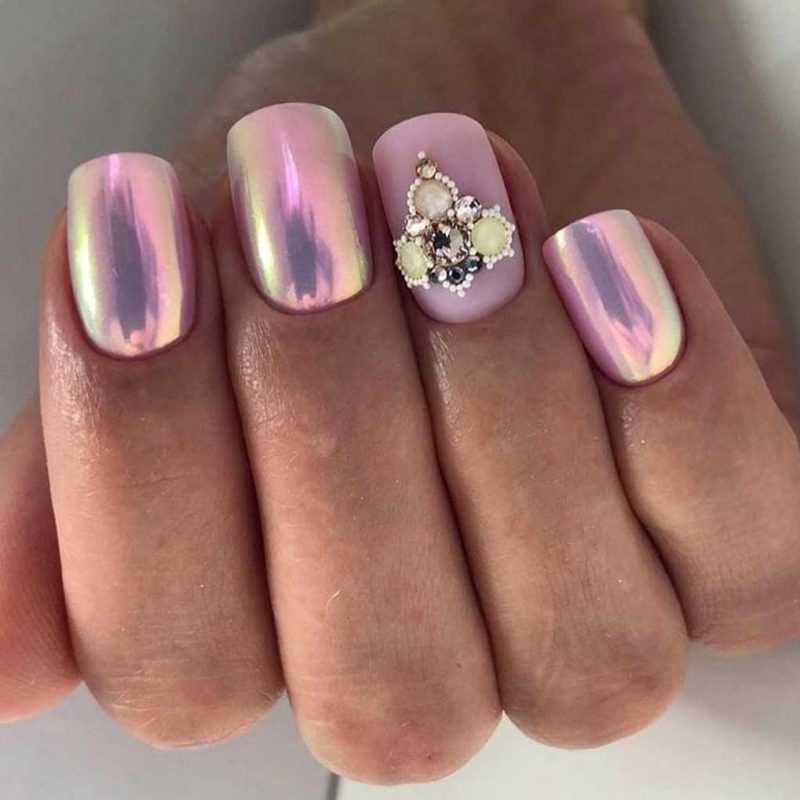 Даже на фото она очень красива, а в жизни, переливаясь под лучами света, она покорит внимание любого, без исключений. Выбирайте жемчужную, зеркальную и хромовую втирку, они лучше остальных работают в тандеме с розовыми оттенками