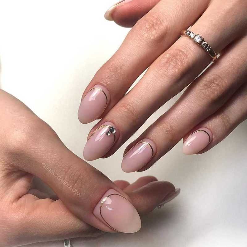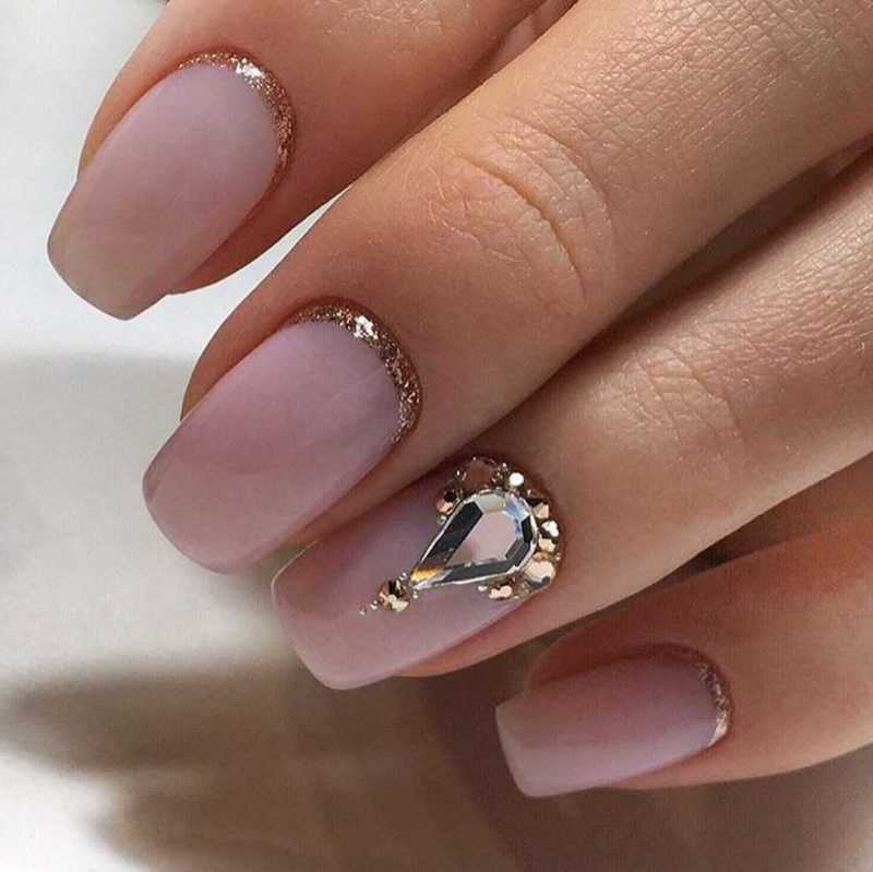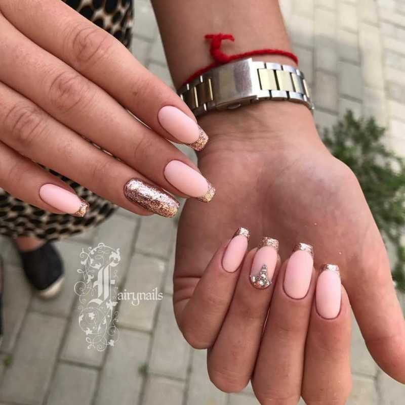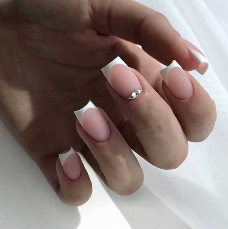 Мягкий квадрат хорошо смотрится с матовыми, однотонными текстурами, золотистыми ленточками, мелкими стразами, французским маникюром. В этом сезоне в тренде сочетание матового и глянцевого лаков на разных пальцах.