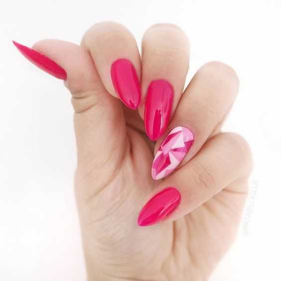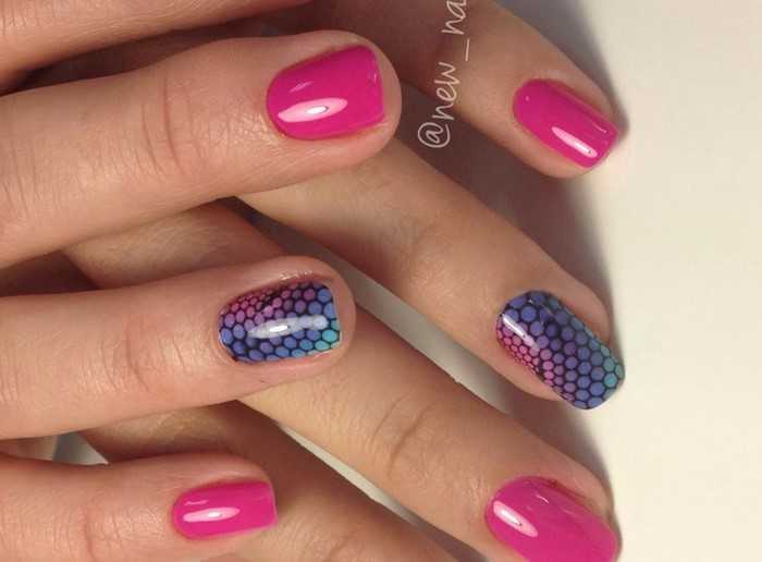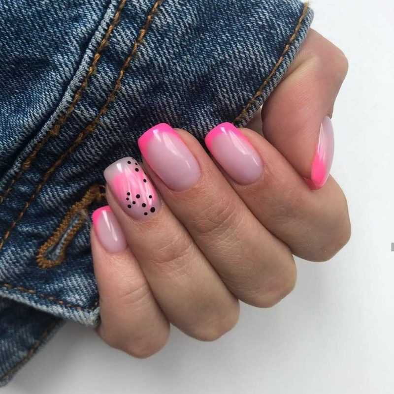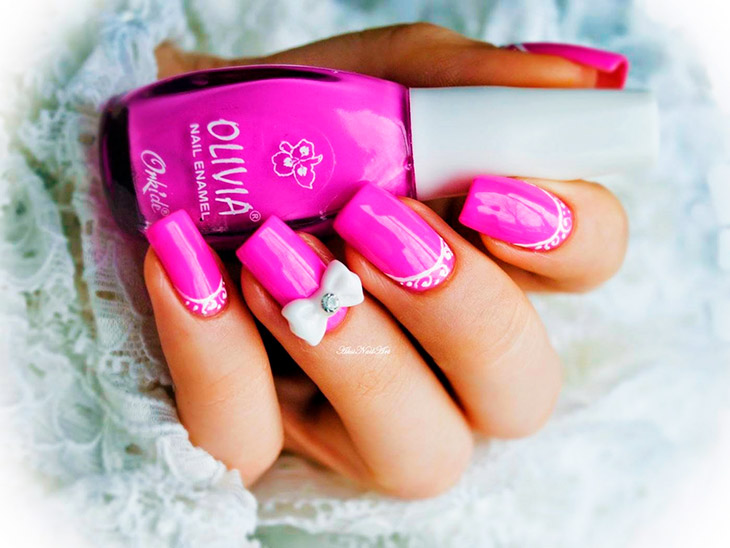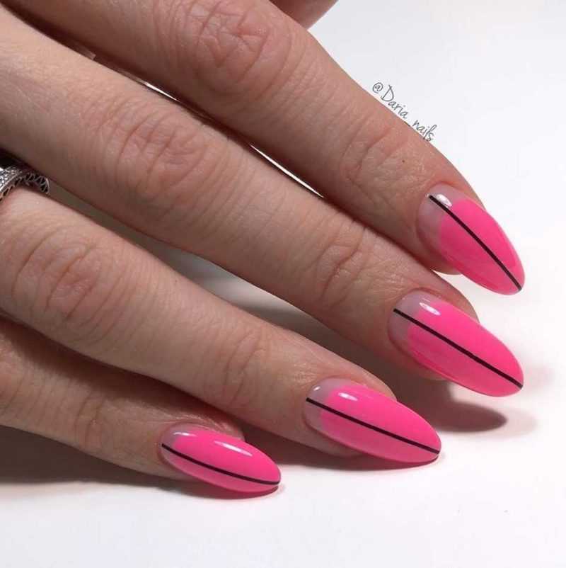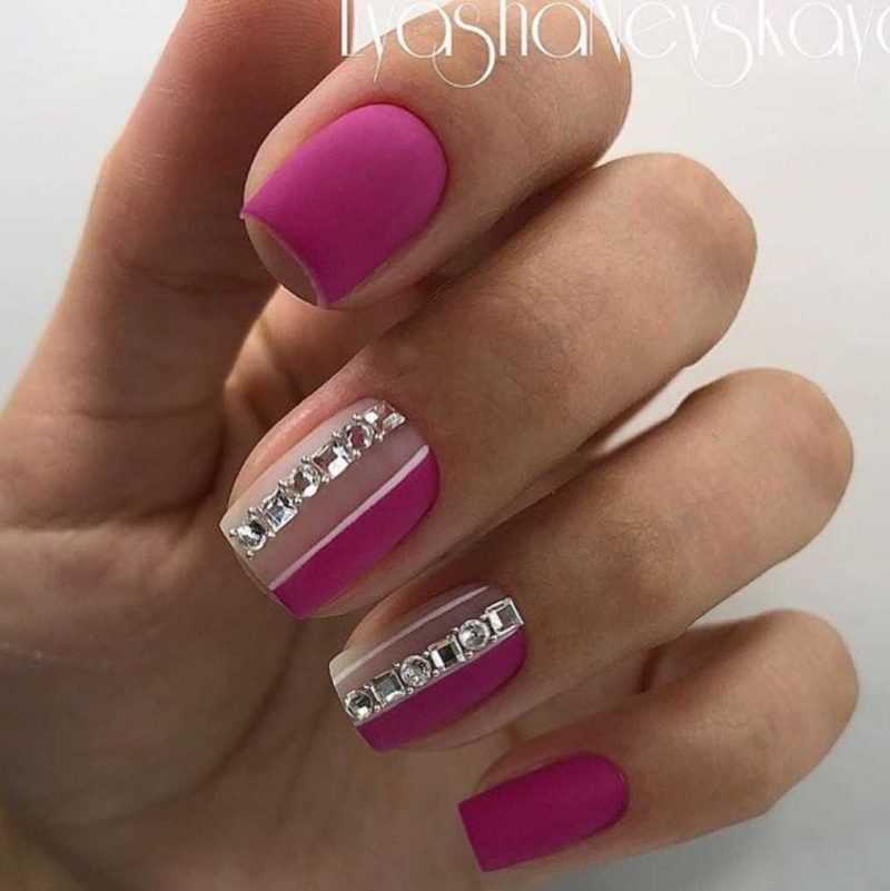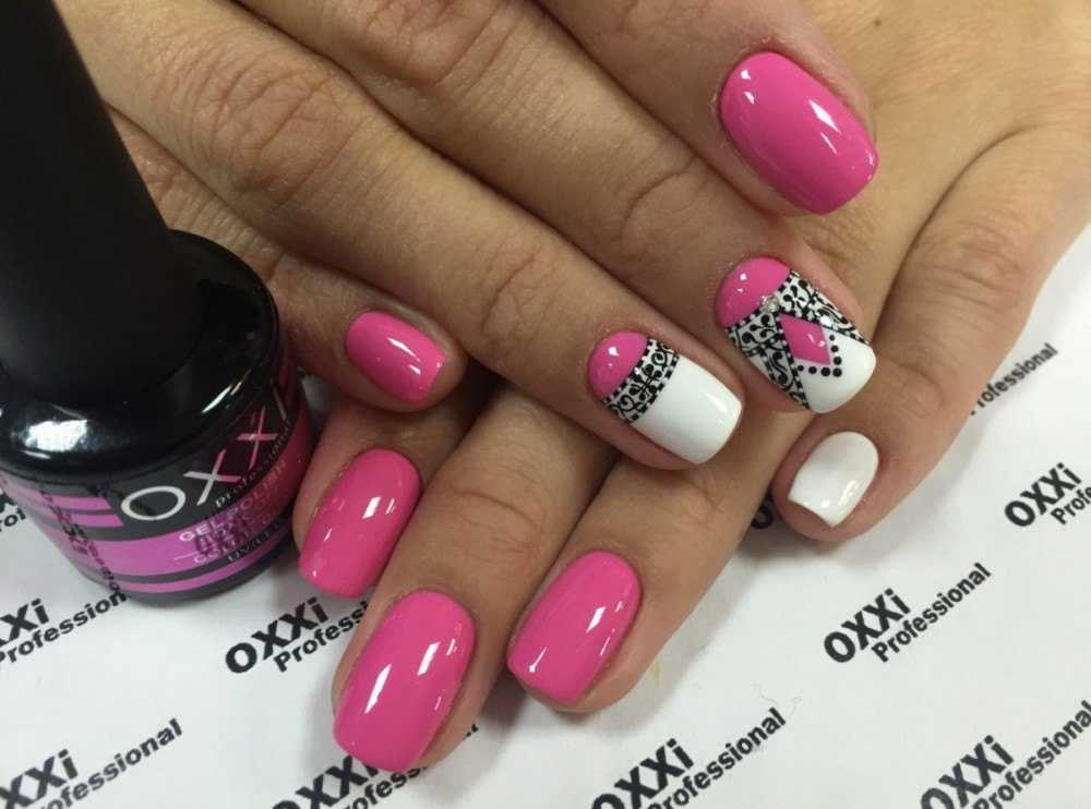 Ярко розовый маникюр отлично будут смотреться в сочетании с белыми полосками, геометрическими фигурами или маленькими точками. Также их можно отделать блестками, фольгой или камнями, сделать концы ноготков разноцветными.