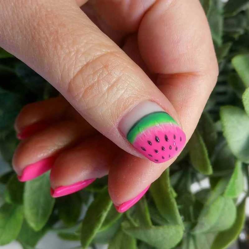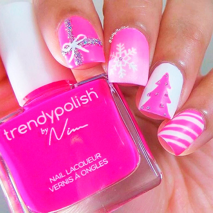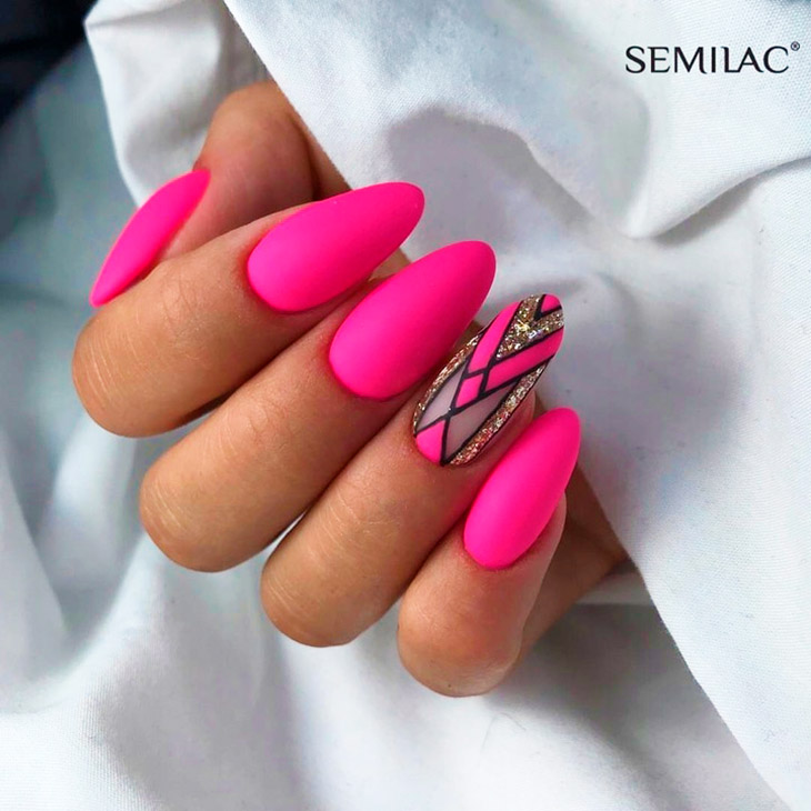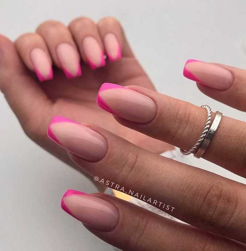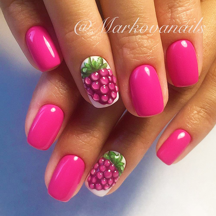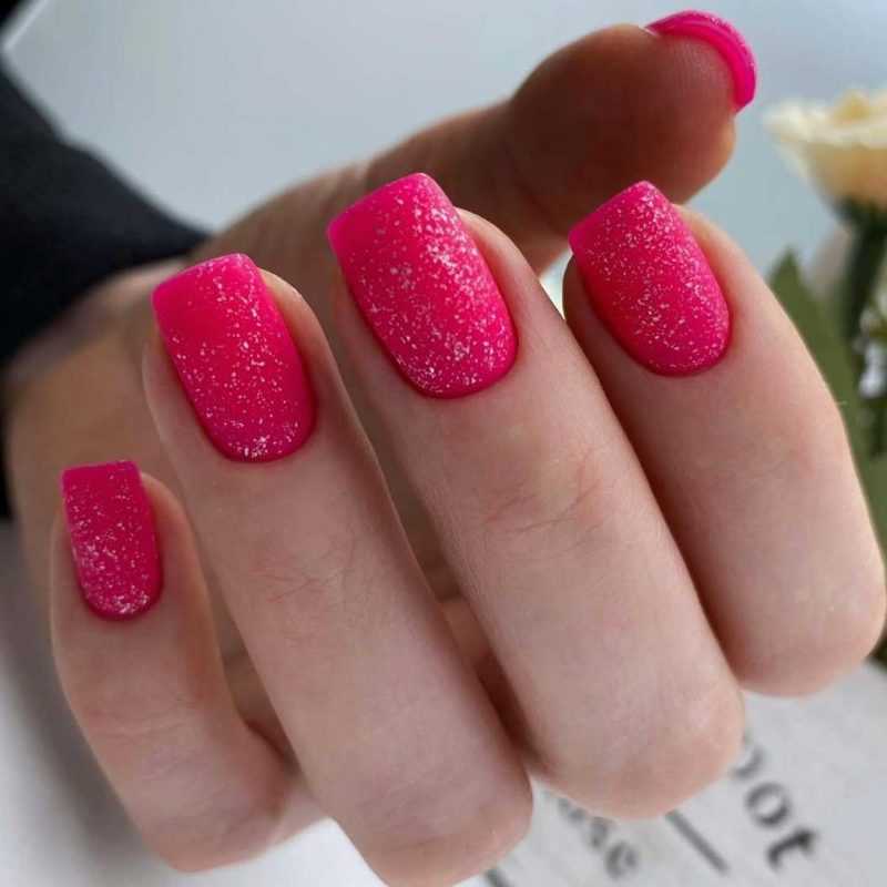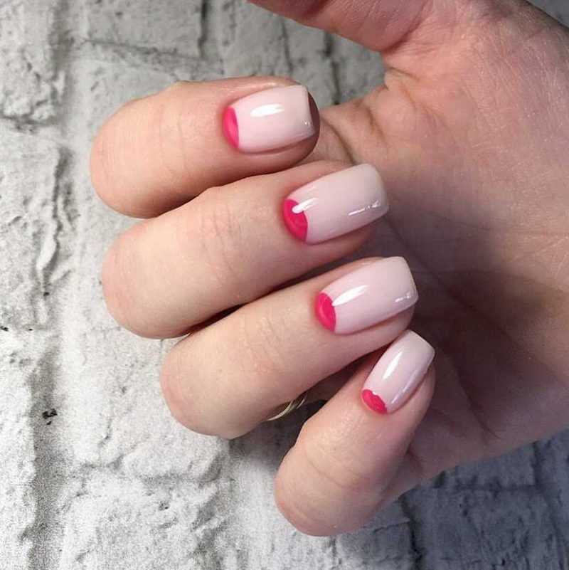Ярко розовый маникюр отлично будут смотреться в сочетании с белыми полосками, геометрическими фигурами или маленькими точками. Также их можно отделать блестками, фольгой или камнями, сделать концы ноготков разноцветными.