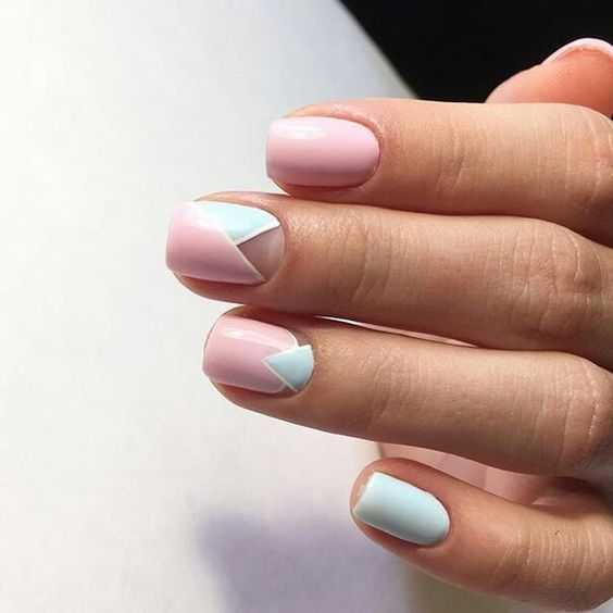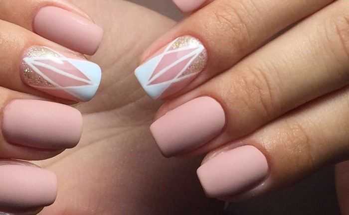 Интересно и утончённо смотрится следующий маникюр. Он является универсальным, так как в качестве основного выбран матовый розовый лак пастельного оттенка. Удачный акцент на отдельных ногтях — геометрический узор в виде белых полос, разделяющих пластинку на несколько частей: треугольники окрашены в нежно-голубой (верхние) и декорированы блёстками (нижние). Геометрические формы в середине ногтевой пластины остались бесцветными, благодаря чему нейл-арт получился особенно нежным и гармоничным.