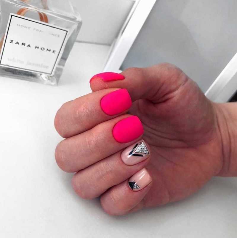 Яркий вариант розового маникюра с геометрией на коротких ногтях квадратной формы: