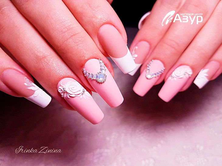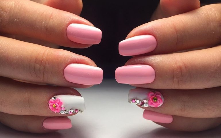 Для особенных событий подойдёт сочетание розового цветочного маникюра с элементами декора: