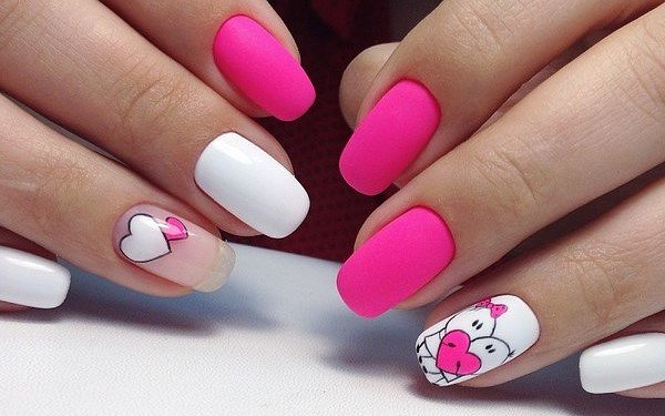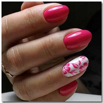 Одно из самых гармоничных и утончённых сочетаний – розовый с белым. С последним цветом можно сочетать как яркие оттенки, так и приглушённые. В дополнении с цветочной росписью каждый из представленных вариантов маникюра смотрится изысканно и романтично.