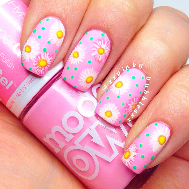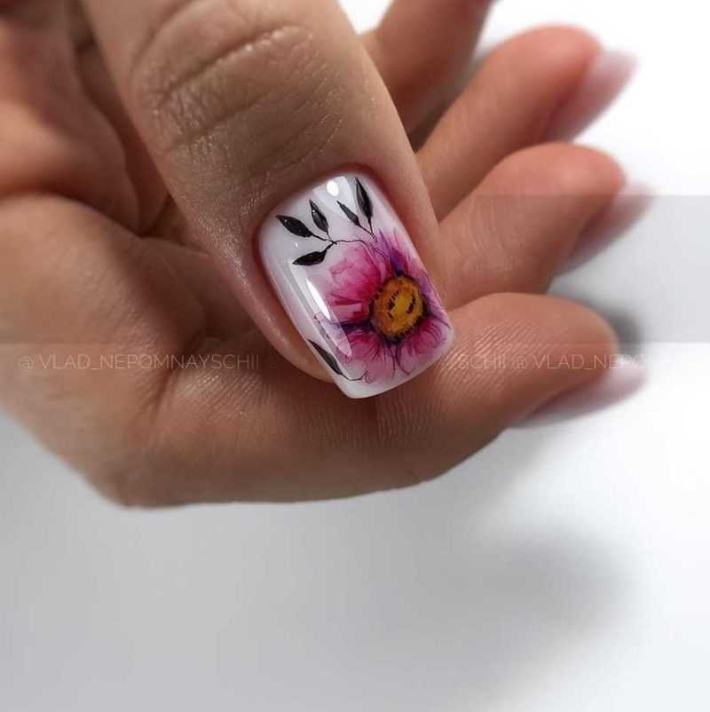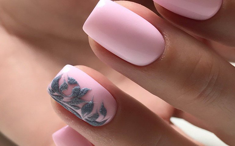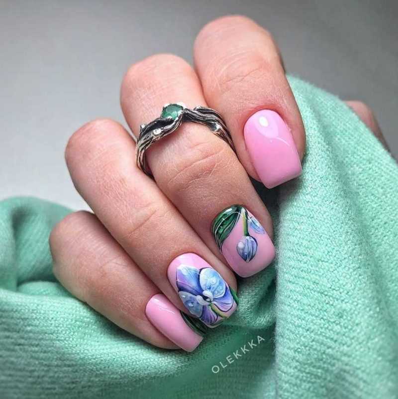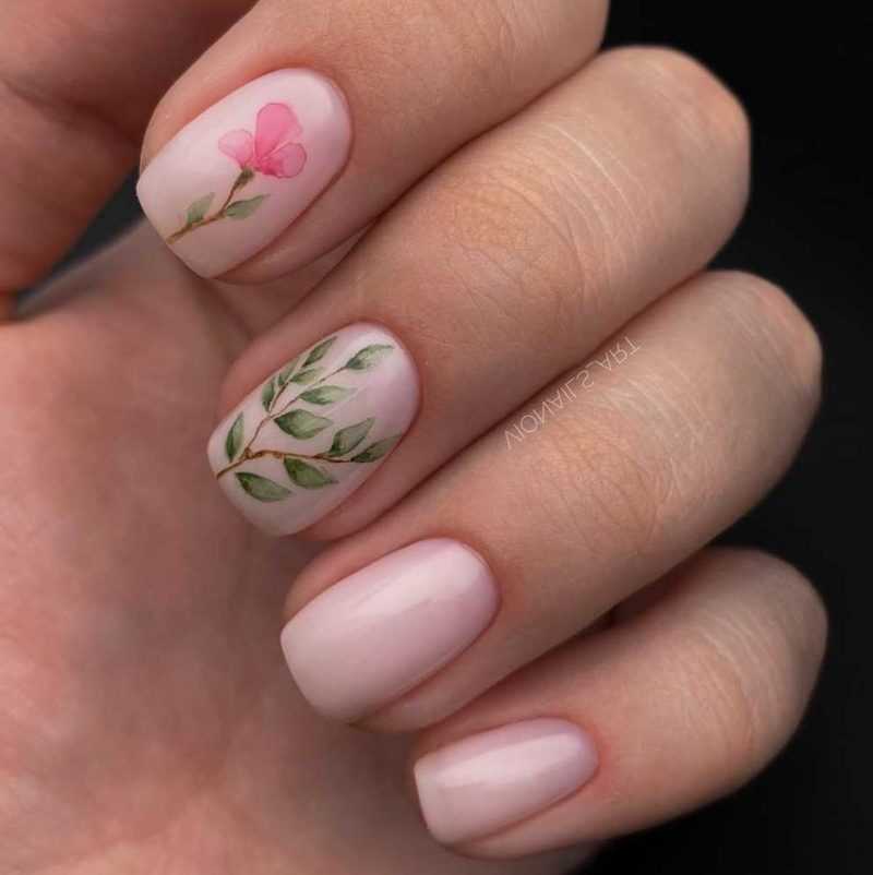 Розовый маникюр с флористическим дизайном может идеально смотреться даже на коротких ногтях или при средней длине пластин: