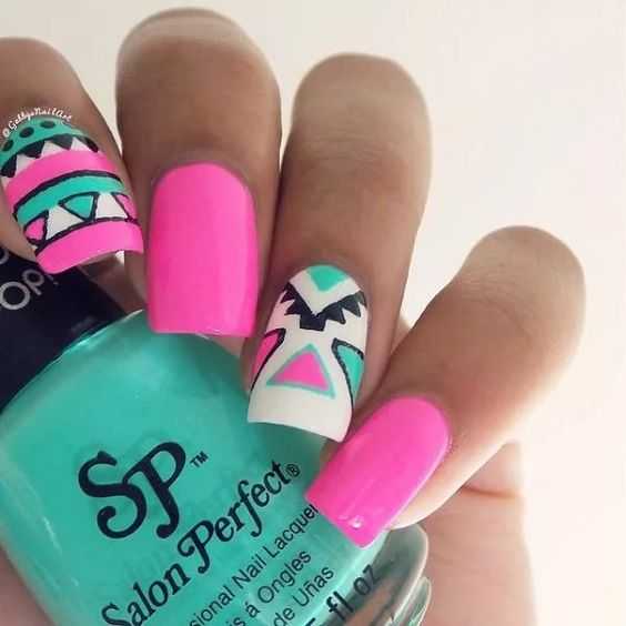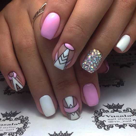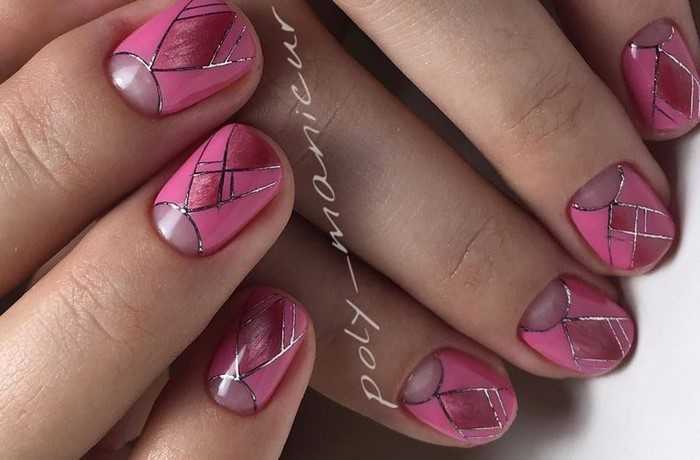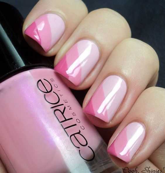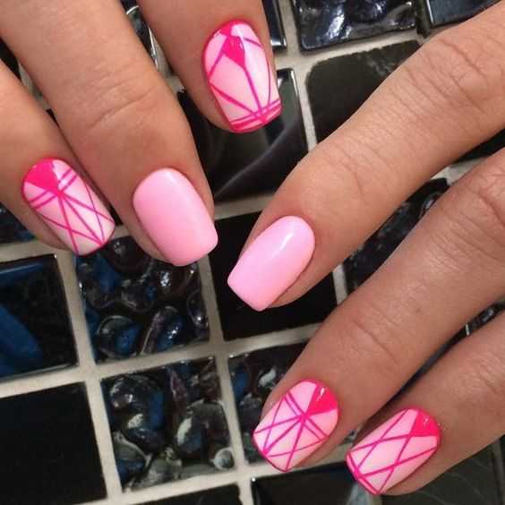 Уже который год подряд остается актуальным геометрический дизайн ноготков. Различные фигуры, треугольники, зигзаги и полосы – все это будет уместным даже в сочетании с розовым цветом.