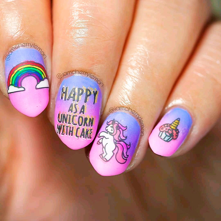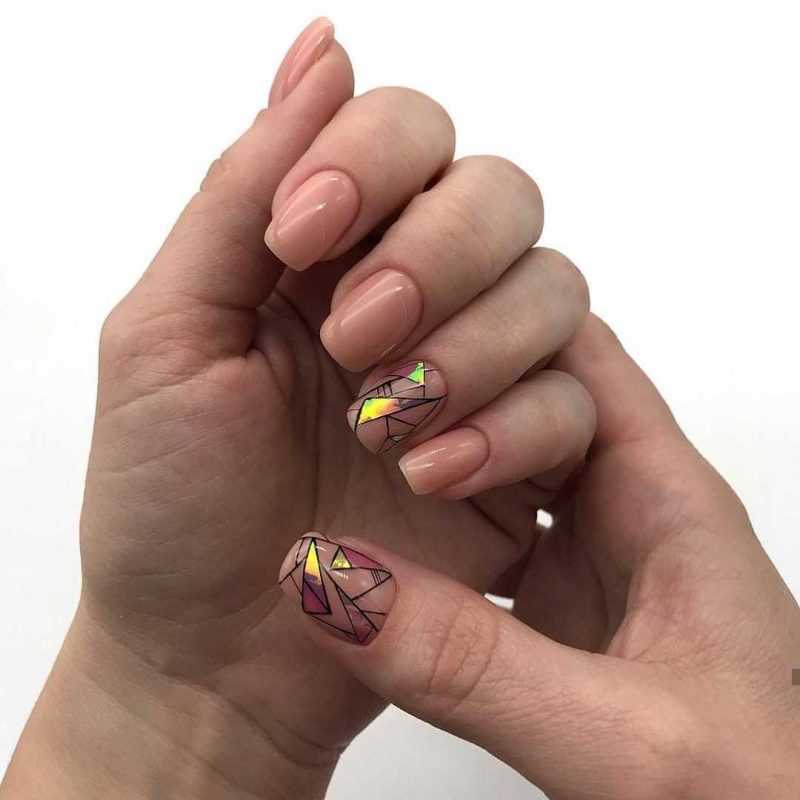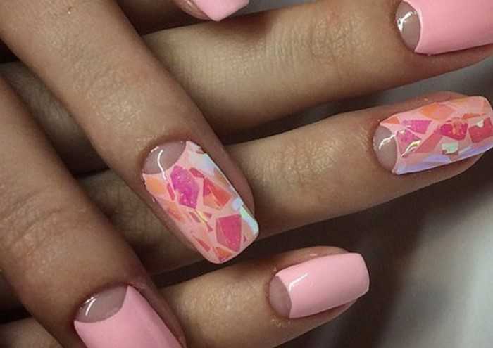 Этот дизайн вопреки устоявшемуся мнению хорош не только на черном фоне. Используйте битое стекло с эффектом “единорог” либо “хамелеон”. Переливаясь разными цветами и играя, они делают ноготки не только нежными, но и необычайно красивыми.