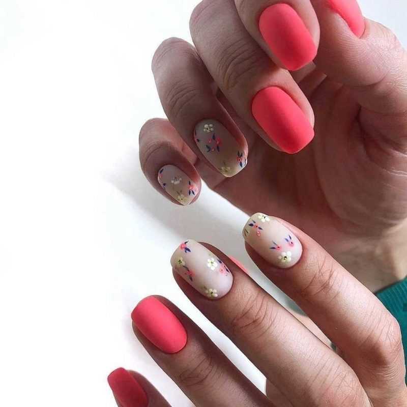 Очень красиво выглядит цветочный принт в сочетании с классическим френчем, матовым покрытием, объёмной росписью.