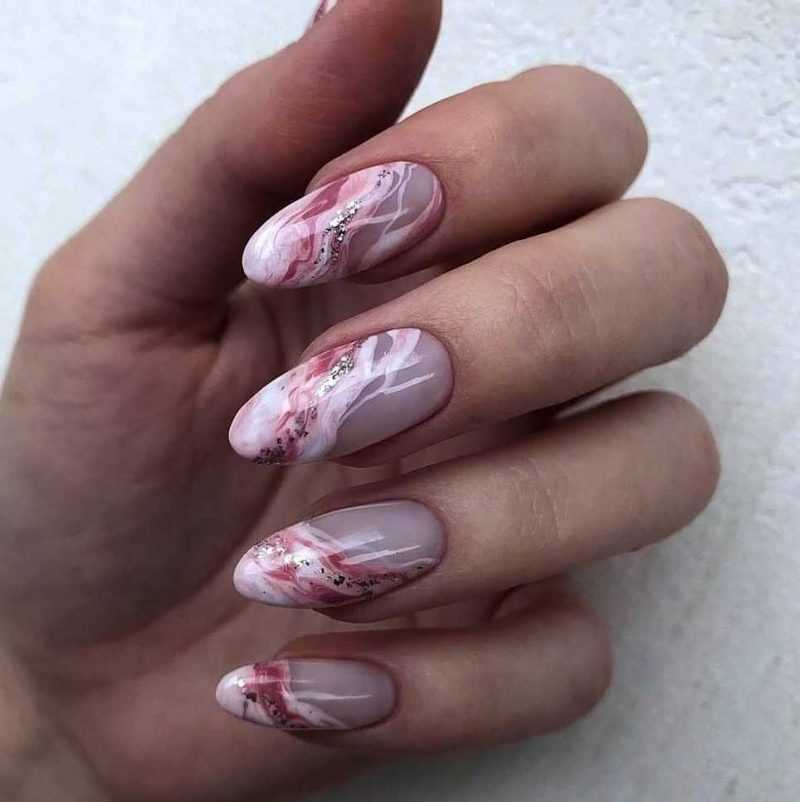 Тональность роз смягчает острую форму, особенно однотонные гель – лаки. Нежнее заостренные ногти смотрятся с градиентами к белым кончикам и прозрачными текстурами, выполненными при помощи шеллака. Актуален френч, блёстки мальвы и серебра в выкладной технике.