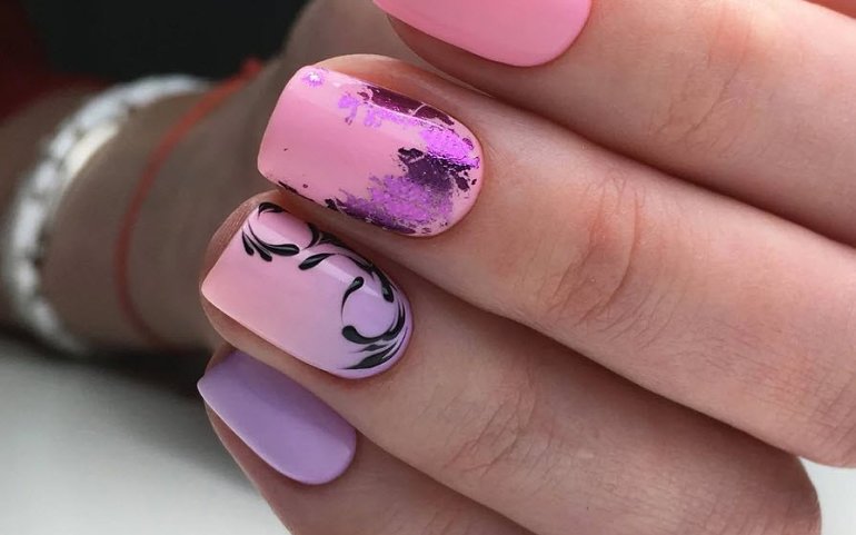Это сочетание более спокойное и смотрится благородно, изящно. При желании его можно украсить тематическим рисунком. Ну и конечно же, если вам по душе пастельная гамма, смело сочетайте розовый с остальными оттенками. Маникюр получится особенно нежным, романтичным.