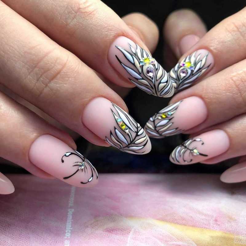 Маникюр цвета пудры, маргаритки и орхидеи делает милыми даже острые стилеты. Лучше выбирать рисунки, в зависимости от формы. Если ноготки квадратные или очень короткие, их лучше удлинить, выбрав правильные сочетания, линии и узоры.