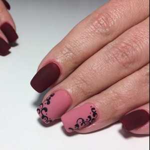 Матовую поверхность покрывают и более интересными узорами, используя глянец. К примеру, это могут быть абстрактные завитки или тоненькая сеточка. Узоры можно наносить как лаками такого же оттенка, так и более тёмными (вишнёвыми, винными, красно-коричневыми).