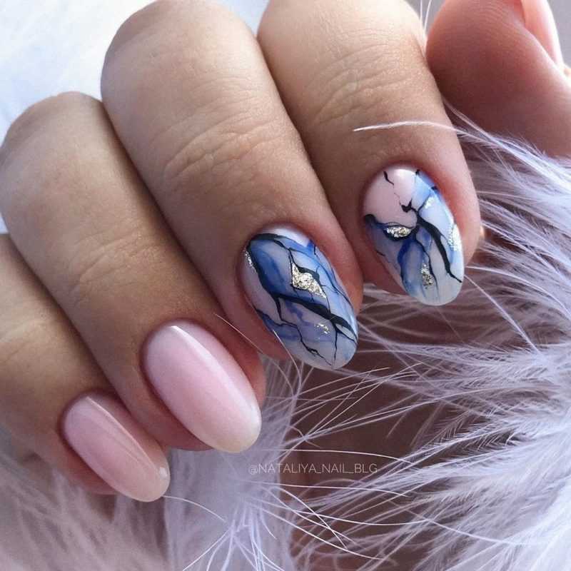 Контрастное оформление миндалевидных пластин в светло-розовой и синей гамме с геометрическим принтом на одном ногте и акриловым напылением на другом – превосходное решение для яркого события!