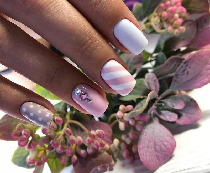 При желании его можно украсить тематическим рисунком. Ну и конечно же, если вам по душе пастельная гамма, смело сочетайте розовый с остальными оттенками. Маникюр получится особенно нежным, романтичным