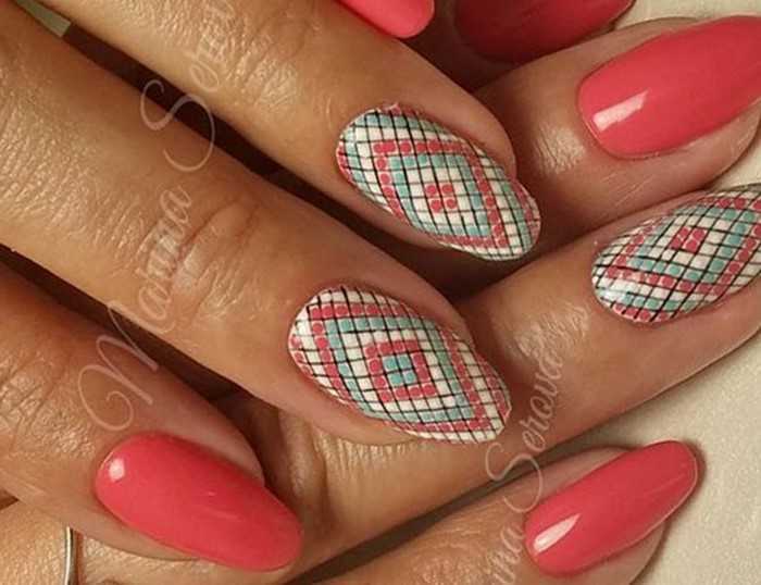 Очень популярным в 2017 году остаётся маникюр с геометрическим дизайном. В тренде различные фигурки: от треугольников до всевозможных зигзагов и полос, объединяющихся в единую композицию. Такой нейл-арт подойдёт для ногтей самой разной длины, но не стоит забывать о том, что в этом сезоне лучше отдать предпочтение коротким и средним ноготкам, воплощающим естественность.