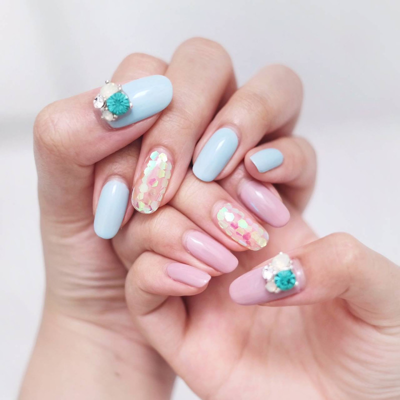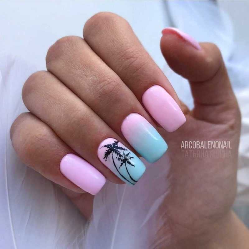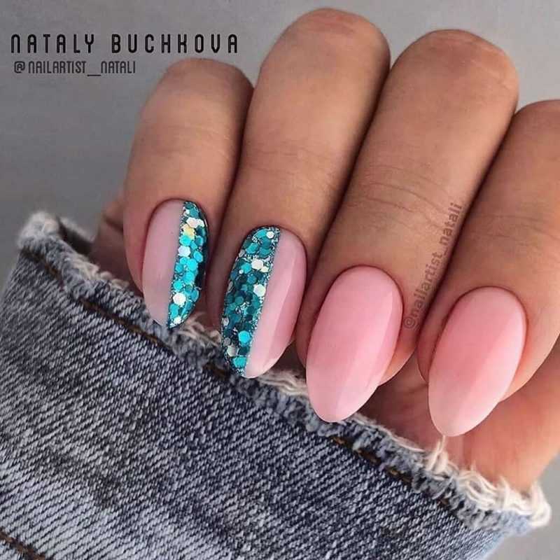 Вставка салатово-голубого оттенка в розовый маникюр внесет в ваш образ свежесть и безмятежность.