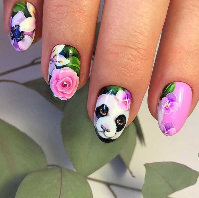 В основном на розовом фоне лучше всего смотрятся бабочки, животные и цветы. Маникюр с розами, пионами, лилиями это прекрасный выбор в весенний и летний период. Сложно придумать маникюр, который бы лучше передал романтичное настроение, чем маникюр с цветами.