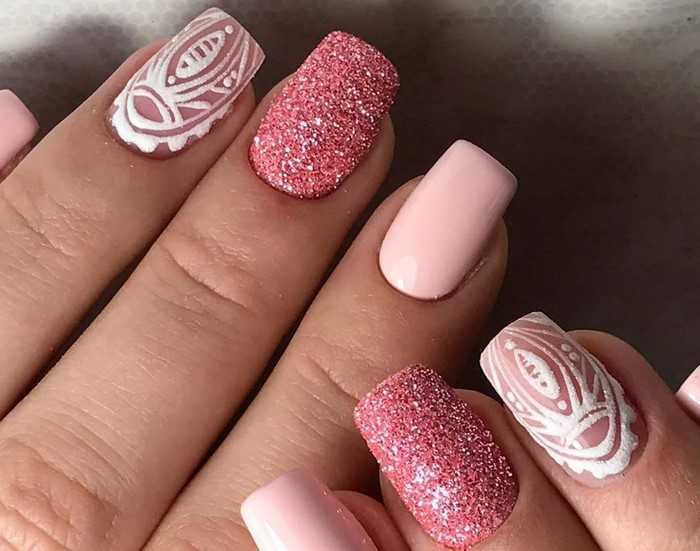 Обычно на спокойные, нежно-розовые тона маникюра наносят замысловатые рисунки в виде мелких цветов и завитков. Хорошо будет смотреться китайская роспись. Украшение стразами или золотым песком добавит блеска и дороговизны вашим ноготкам, но здесь главное не переусердствовать иначе выйдет обратный эффект.
