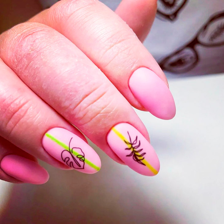 Объёмная роспись на розовых ногтях смотрится особенно красиво и необычно: