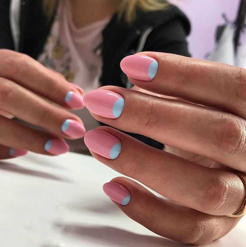 Отличным вариантом станет лунный дизайн розового маникюра, если у вас короткие ногти. Причем основным цветом могут быть розовые тона, а выделяемые лунки нежно-голубыми, белыми или светло зелеными. Такое исполнение непременно добавит шарма и элегантности.