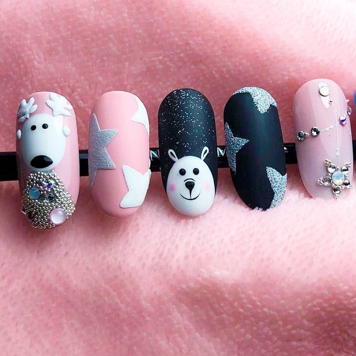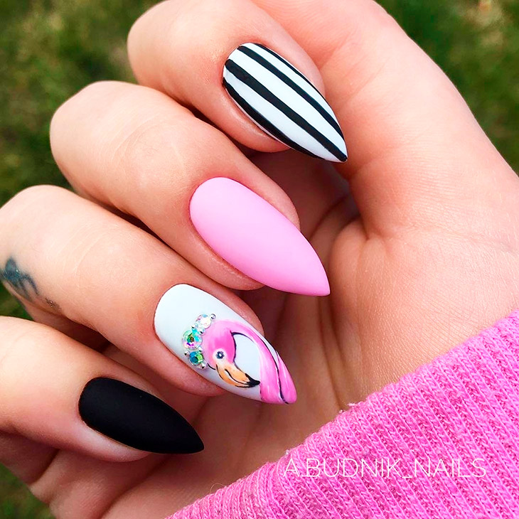 Нельзя не отметить сочетание розового с классическими черным и белым цветом. В первом случае маникюр получится весьма активным, контрастным. Поэтому надо обязательно продумать все нюансы оформления. С белым цветом дизайн определенно будет более мягким. Такое сочетание идеально подходит для создания френча, абстракции и других интересных рисунков. Его называют одним из самых нежных решений в любом времени года. Ну и конечно же, наличии декора в виде страз всегда положительно влияет на маникюр. Он становится более ярким, заметным и праздничным. Но все зависит исключительно от их количества. Для повседневной жизни лучше использовать буквально несколько штук на двух-трех ноготках.